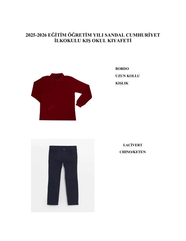 Bu kapsamda okulumuzda ikinci dönemden itibaren üst giysi olarak BORDO renk tercih edilmiş olup, alt giyim olarak da LACİVERT pantolon seçilmiştir. Görsellerdeki kıyafetler renk tercihini göstermek için verilmiştir, velilerimiz dilediği markadan ister V yaka ister polo yaka isterse de balıkçı yaka giyim tercihi yapabilir, ancak renk BORDO olacaktır.