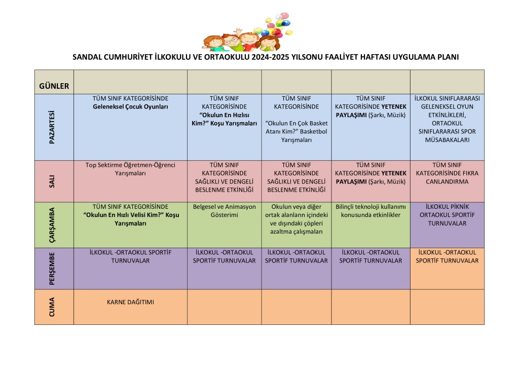 Millî Eğitim Bakanı Yusuf Tekin'in talimatıyla geçen yıl okullarda dönem bitimi öncesindeki son hafta öğrencilerin sanatsal, kültürel, sportif ve bilimsel faaliyetlere katılmalarını teşvik etmek amacıyla hayata geçen "dönem sonu faaliyet haftası" uygulaması, ülke genelinde 16-19 Haziran tarihleri arasında yapılacak.Öğrenciler, 2024-2025 eğitim öğretim yılı tamamlanırken, 2025'in "Aile Yılı" olarak kabul edilmesi nedeniyle söz konusu haftayı "Aile ve Oyun" temasıyla yaşayacak.